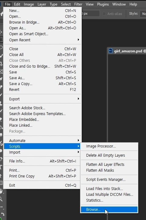 3. File > Scripts > Browse로 눌러서 스크립트를 실행시키면 됩니다.